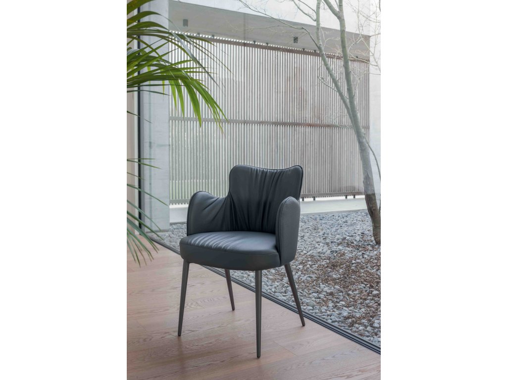 Designové křeslo Minnie se širokým sedákem a příjemným opěradlem se vyznačuje měkkými liniemi, díky nimž je obzvláště pohodlné. Kónické nohy jsou ideální pro použití vedle jídelních stolů nebo v předsíních a ložnicích, kde dodávají mimořádnou všestrannost a osobitý styl.