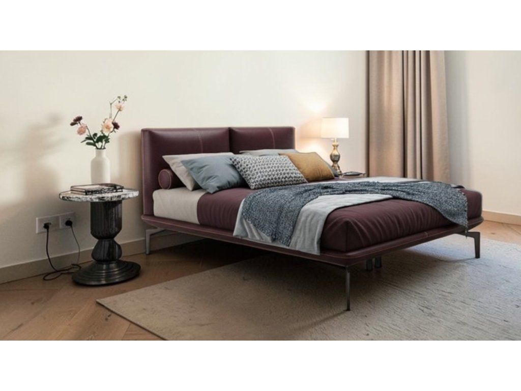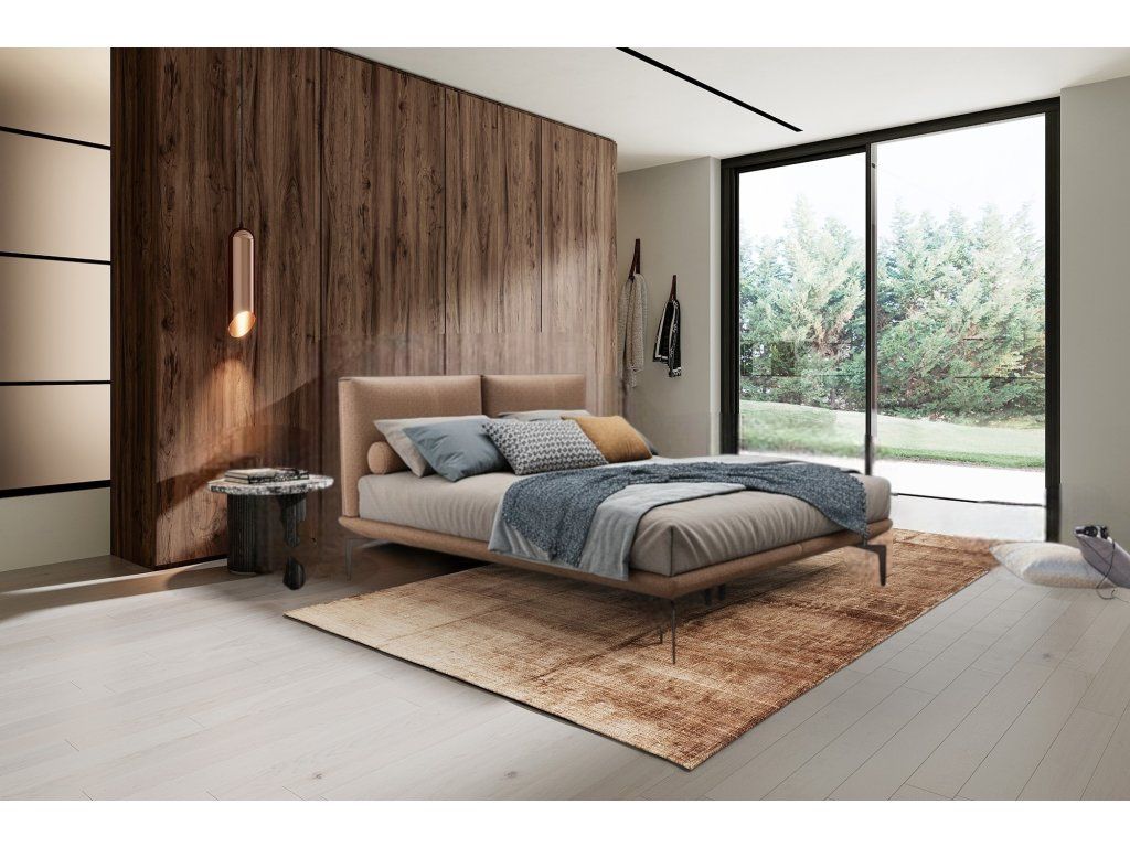 Čisté linie, matrace zarovnaná s rámem postele a inovativní rám vyvažují objem nádherného čela postele, ozdobeného tkaným prošíváním umístěným na koncích dvou velkých polštářů. Výsledkem je návrh postele s menšími celkovými rozměry.