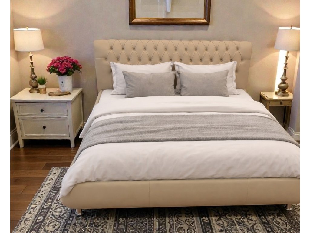 Luxusní kožená postel VERO je elegantní s vysokým čelem o výšce 100 cm. Čelo se vyznačuje výrazným knoflíkovým prošitím. Zaoblené bočnice celkově esteticky navazují na dominantní čelo postele. Postel je konstruována z vysoce kvalitních materiálů a propracována do každičkého detailu. Možnost výběru ze dvou variant otevírání postele, možnost úložného boxu. Za příplatek je možné nahradit knoflíky krystaly od Swarovského.