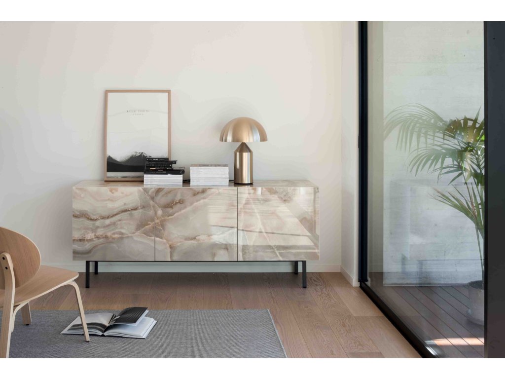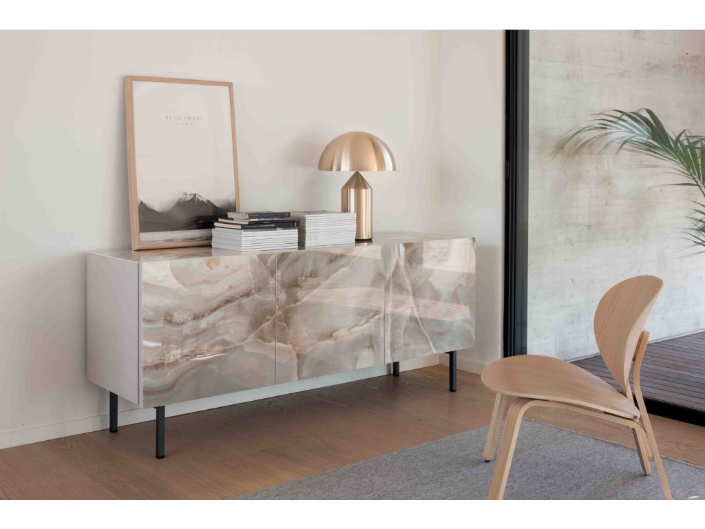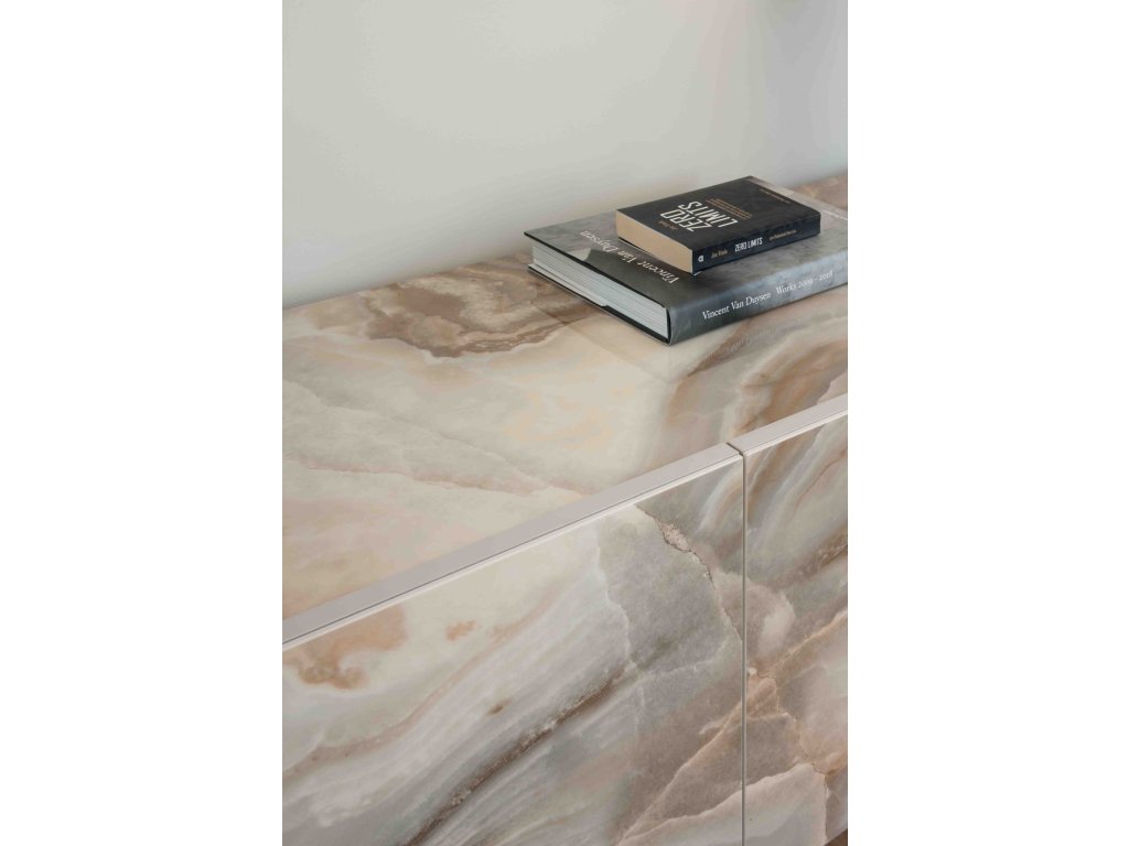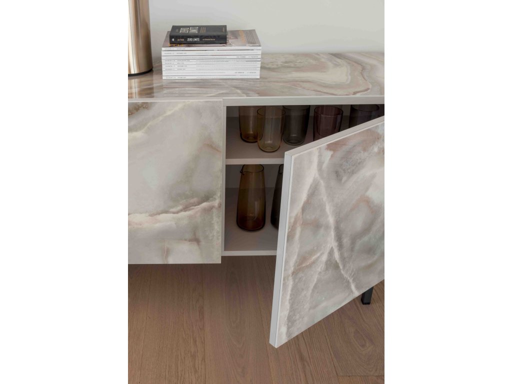 Melaminový příborník se 2, 3 nebo 4 dvířky a vnitřními policemi z melaminu. Horní deska i dvířka jsou opatřeny keramickým povrchem s plynulou návazností žilkování.