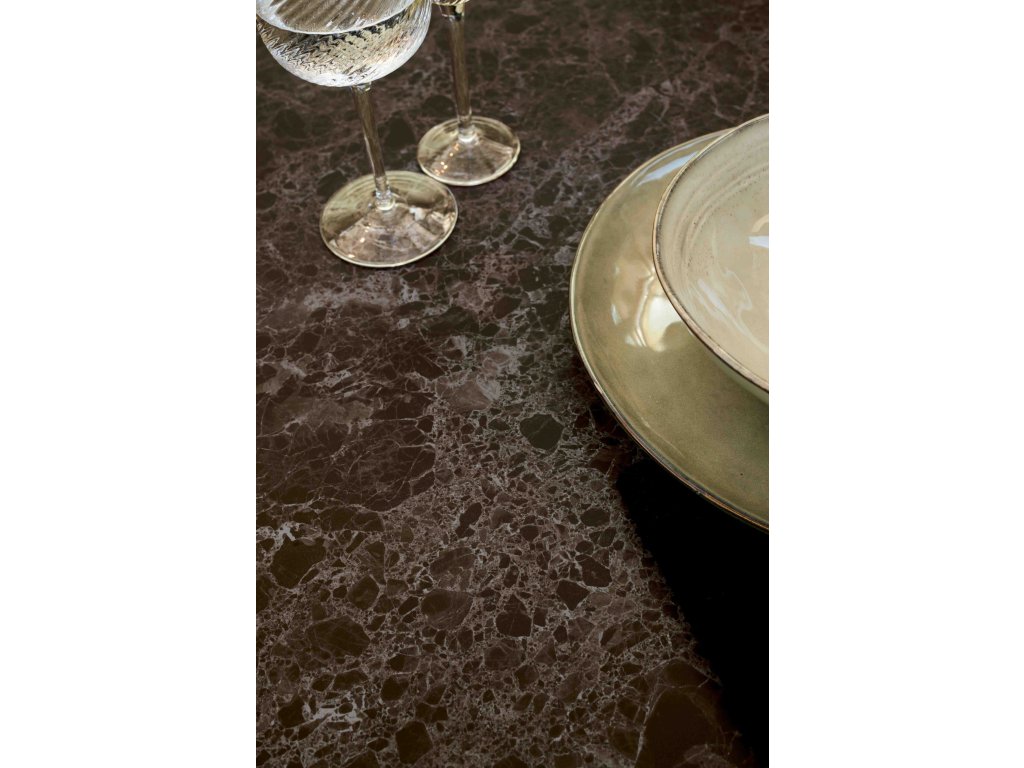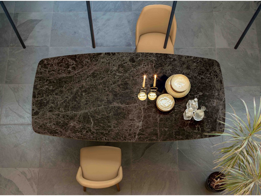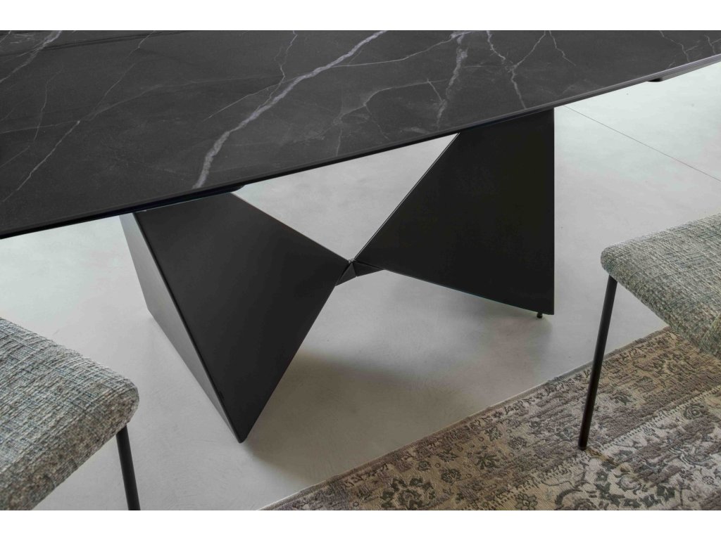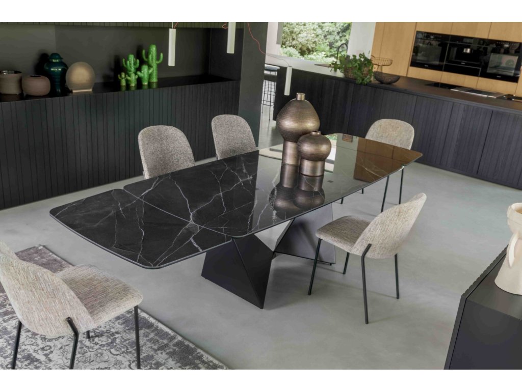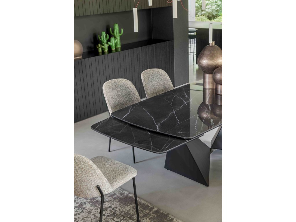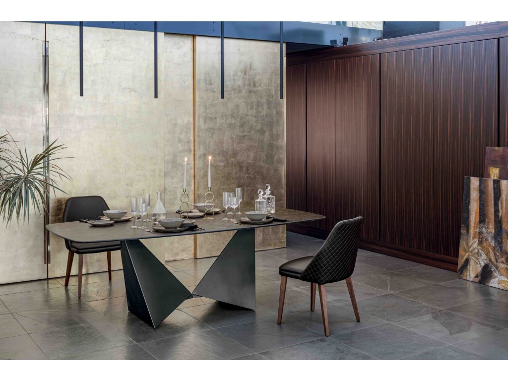Keramická deska s jemnou kresbou působí noblesně a je zároveň mimořádně odolná. Sochařsky tvarovaná kovová podnož dodává stolu stabilitu i vizuální lehkost. Origami se přirozeně stává dominantou prostoru pro každodenní používání i slavnostní chvíle...