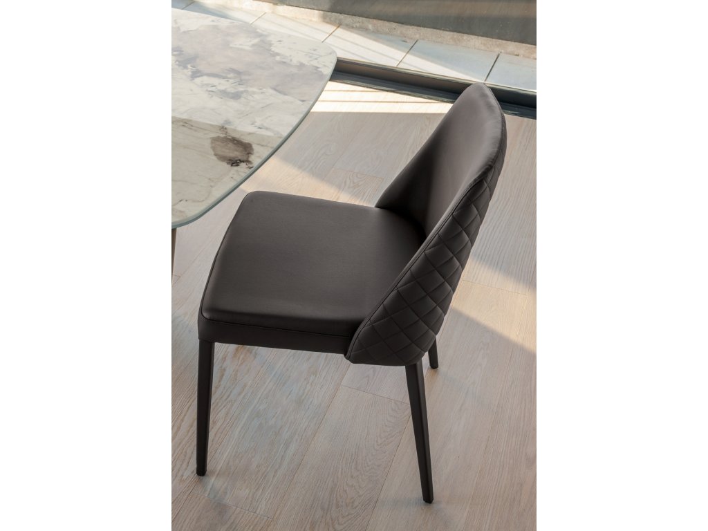 Židle s kovovým rámem, čalouněným korpusem a nohami. Prošívaná opěrka zad. Barevně sladěné prošívání.