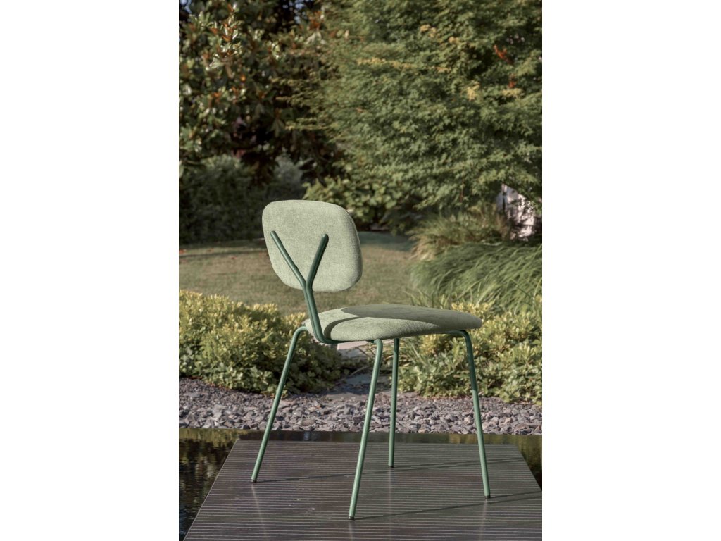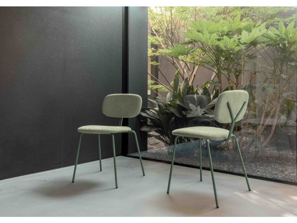 Židle s epoxidově lakovanými kovovými nohami a čalouněnou skořepinou. Barevně sladěné prošití.