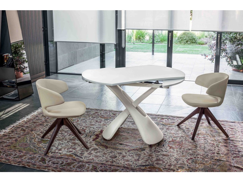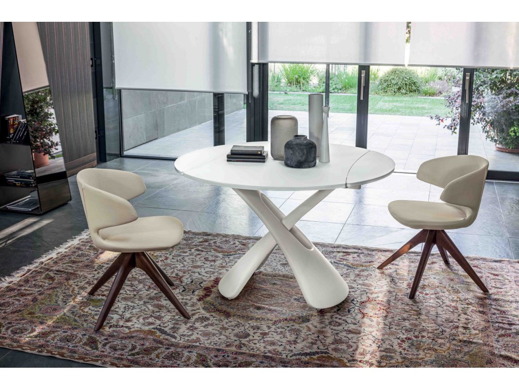 Designově výrazná nepravidelná obdélníková deska se jednoduchým pohybem rozloží do kulatého tvaru, čímž nabídne ještě více prostoru pro stolování.